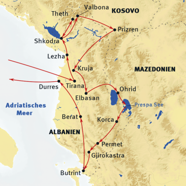 Tirana - Lesha- Shkodra - Theth - Koman-See - Valbona-Tal - Kosovo (Gjakovo - Prizren) - Kruja - Elbasan - Mazedonien (Ohrid - Galicica NP - Prespa- See) - Korca - Permet - Gjirokastra - Butrint - Berat - Durres