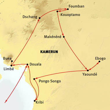 Douala - Limbe - Buea - Limbe - Dschang - Ekom Nkam-Wasserfall - Foumban - Kouoptamo - Makenéné - Yaoundé - Ebogo - Yaoundé - Pongo Songo - Kribi - Douala