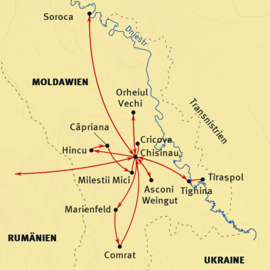 Chisinau - Clisova Noua - Soroca - Dolna - Hancu - Capriana - Milestii Mici - Cricova - Curci - Orheiul-Vechi - Gagausien (Comrat - Marienfeld) - Transnistrien (Tiraspol - Tighina)