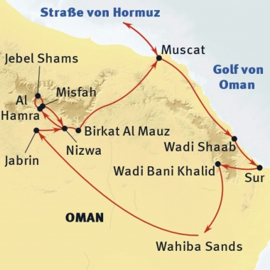 Muscat - Quriyat - Bimah Sinkhole - Fins Beach - Wadi Shaab - Sur - Wahiba Sands - Wadi Bani Khalid - Ibra - Jabrin - Nizwa - Al Hamra - Jabal Shams - Misfah - Muscat