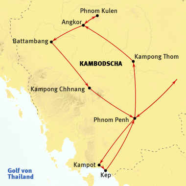 Phnom Penh - Kampong Thom - Angkor - Phnom Kulen - Tonle Sap - Beng Malea - Banteay Srey - Battambang - Kamponh Chhnang - Kampot - Kep