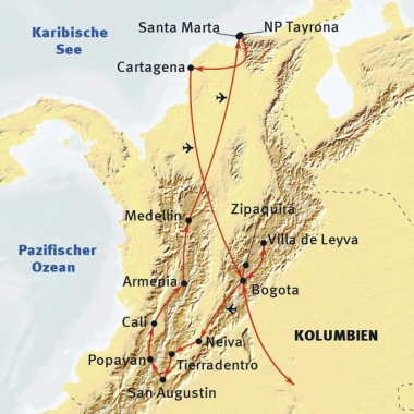 Bogota - Villa de Leyva - Neiva - Tierradentro - San Agustin - Popayan - Armenia - Medellin - San Agustin - Sta Marta - NP Tayrona - Cartagena