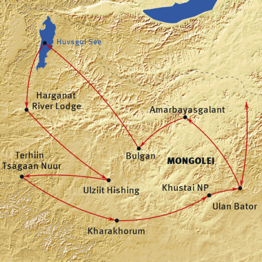 Ulan Bator - Amarbayasgalant - Bulgan/Uran Togoo - Huvsgul See - Harganat River Lodge - Ulziit Hishig - Terhiin Tsagaan Nurr - Kharakorum - Khustai Nationalpark - Ulan Bator