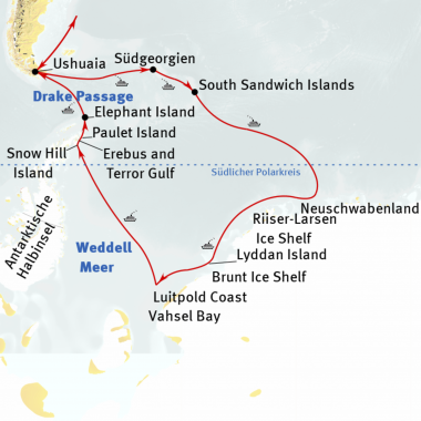 Ushuaia - Südgeorgien - Südliche Sandwichinseln - Neuschwabenland - Vahsel Bay - Larsen-Schelfeis - Paulet- und Devil Island - Elephant Island - Ushuaia