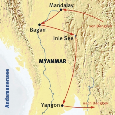 Die ideale Reisezeit für Myanmar ist zwischen Anfang November und Ende März. In der Regenzeit (Mai bis Oktober) muss mit wetterbedingten Programmänderungen und Flugausfällen gerechnet werden. In der Regenzeit sind keine Badeverlängerungen in Myanmar möglich.
