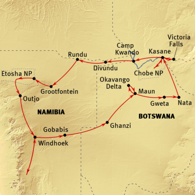 Windhoek - Gobabis - Botswana: Ghanzi - Maun - Okavango Delta - Gweta - Chobe Nationalpark - Namibia: Caprivi Zipfel - Rundu - Grootfontein - Etosha Nationalpark