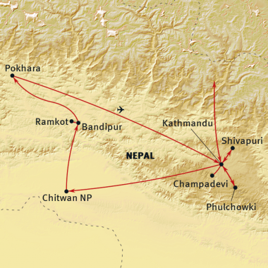 Kathmandu - Champadevi - Phulchowski - Shivapuri - Kathmandu - Chitwan Nazionalpark - Bandipur - Ramkot - Bandipur - Pokhara - Kathmandu