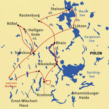 Masuren heißt unberührte Natur wie aus einem alten Bilderbuch: schwarze Wälder, sanfte Hügel, weite Heideflächen, verträumte Dörfer, kristallklare Flüsse und tausende Seen, die wie Juwelen glitzern, prägen eine der schönsten polnischen Landschaften. Ein wahrhaftiges Naturparadies für weiße Störche aber auch Wölfe, Luchse, Marder, Wisente und Polnische Pferde, die sogenannten Tarpane, streifen heute noch durch die unendlichen Wälder. In den letzten Jahren wurden fünf Landschaftsparks und zahlreiche weitere Naturreservate in dieser Region der Masurischen Seenplatte gegründet, um dem Gast die Einmaligkeit dieser Natur zu bewahren. Als sogenannte "Grüne Lunge Polens" und als eine der schönsten Radwanderregionen Europas, zählen die Masuren heute zu einem beliebten Reiseziel. Begeistert mit dem Rad entlang hundertjähriger Alleen unterwegs zu sein und dabei diese einmalige Flora und Fauna besonders intensiv erleben zu können, zählt zu einem der Höhepunkte auf einer solchen Radreise inmitten eines wahren Naturparadieses. Den Zauber der Masuren mit seinen geheimnisvollsten Ecken gilt es zu entdecken! Anforderungen an die Teilnehmer: Die moderaten, zum Teil leicht hügeligen Tagesetappen zwischen 15 und max. 60 km kann jeder mit einer normalen bis guten Kondition bewältigen. Die Fahrt erfolgt meist auf kleinen unbefestigten Feld- und Waldwegen sowie asphaltierten Nebenstraßen. Leichter Rucksack für das Tagesgepäck. Trekkingräder mit 7-Gang Nabenschaltung oder 21-Gang Kettenschaltung (mit/ohne Rücktrittbremse) inkl. Satteltasche werden vor Ort gestellt. Auf Wunsch ist auch die Nutzung eines eBikes gegen Aufpreis möglich.