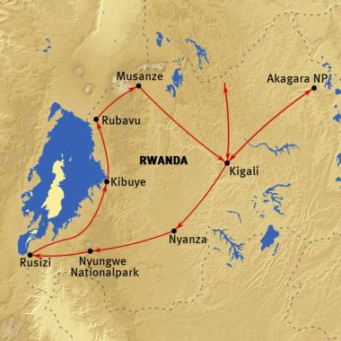 Kigali - Akagera Nationalpark - Nyanza - Nyungwe Nationalpark - Rusizi - Kibuye - Rubavu - Musanze - Kigali