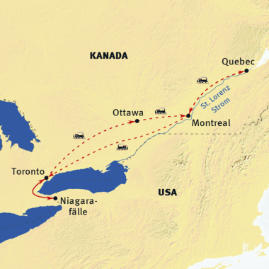 • Eine ausführliche Städtereise mit den Höhepunkten der Metropolen am Lake Ontario und entlang des St. Lorenz-Stroms