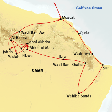 Muscat - Quriat - Wadi Tiwi - Sur - Wahiba - Wadi Bani Khalid - Ibra - Birkat al Mauz - Jabal Akhdar - Nizwa - Al Hamra - Misfah - Jabrin - Wadi Bani Awf - Muscat
