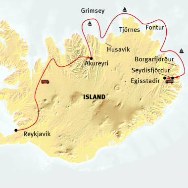 Reykjavik - Akureyri - Grimsey - Husavik - Skjafandi-Bucht - Raufarhöfn - Vopnafjörður - Borgarfjörður Eystri - Seyðisfjörður - Egilsstaðir