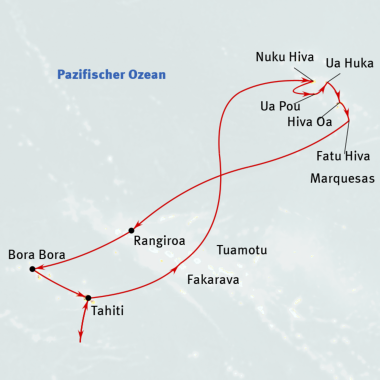 Papeete - Fakarava / Kauehi - Nuku Hiva - Ua Pou - Ua Huka - Tahuata - Hiva Oa - Fatu Hiva - Rangiroa / Makatea - Bora Bora - Papeete