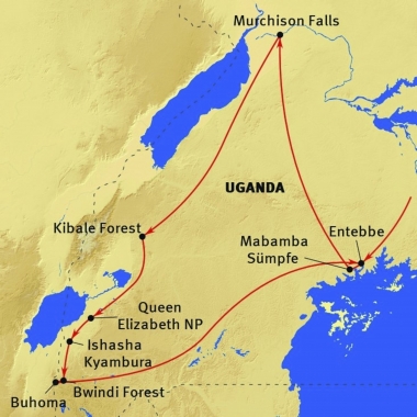 Entebbe - Mambamba - Ziwa - Murchison Falls Nationalpark - Kibale Forest - Queen Elisabeth Nationalpark - Ishasha - Kyambura - Bwindi Forest - Buhoma