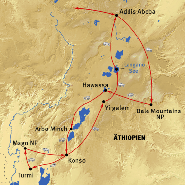 Addis Abeba - Bale Mountains Nationalpark - Shashemene - Arba Minch - Konso - Mago Nationalpark - Turmi - Yirgalem - Langano See