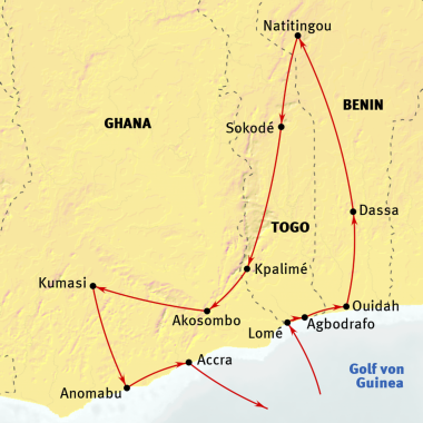 Lomé - Agbodrafo - Ouidah - Ganvié - Abomey - Dassa - Naitingou - Defale - Sokode - Atakpame - Kpalime - Koforidua - Kumasi - Anomabu - Accra